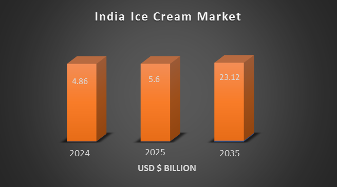 - India Ice Cream Market Size is Expected to Grow from USD 4.86 Billion in 2024 to USD 23.12 Billion in 2035, Growing at a CAGR of 15.23% during the forecast period 2025-2035.