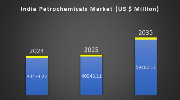 - India Petrochemicals Market Size is expected to Grow from USD 39474.22 Million in 2024 to USD 59180.11 Million by 2035, growing at a CAGR of 3.75% during the forecast period 2025-2035.