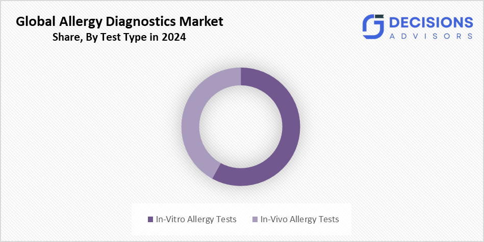 Based on the test type, the allergy diagnostics market is divided into in-vitro allergy tests and in-vivo allergy tests. Among these, the in-vitro allergy tests segment accounted for the highest market revenue in 2024 and is anticipated to grow at a significant CAGR during the forecast period. This is because they provide quantitative results that help long-term illness surveillance and safer testing conditions for individuals at risk of severe reactions. Automated immunoassay analysers and other technological advancements improve sensitivity and shorten turnaround times.