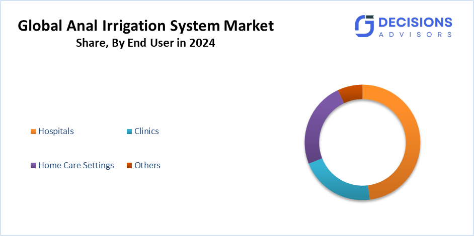 Based on the end user, the anal irrigation system market is segmented into hospitals, clinics, home care settings, and others. Among these, the hospitals segment accounted for the highest market revenue in 2024 and is anticipated to grow at a significant CAGR during the forecast period. This is because they serve as patients' primary care providers for serious bowel problems; hospitals account for a large share of the market. Anal irrigation systems are used in hospital settings for patients who need intense bowel care, frequently as part of an all-encompassing treatment plan for chronic bowel problems, neurological illnesses, or post-surgical rehabilitation. Hospitals' controlled and structured environments guarantee that these systems are used efficiently, with medical personnel on hand to oversee and modify treatment plans as necessary.