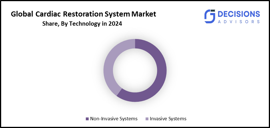 Based on the technology, the cardiac restoration system market is divided into non-invasive systems and invasive systems. Among these, the non-invasive systems segment accounted for the highest market revenue in 2024 and is anticipated to grow at a significant CAGR during the forecast period. This is due to their methods that reduce patient discomfort and greatly improve the patient experience. Advanced imaging techniques like MRI and echocardiography are frequently used in these systems, enabling comprehensive diagnosis without the need for surgery.