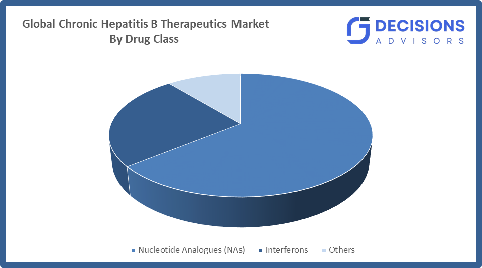Based on the drug class, the chronic hepatitis B therapeutics market is divided into nucleotide analogues (NAS), interferons, and others. Among these, the nucleotide analogues (NAS) segment accounted for the largest share in 2024 and is anticipated to grow at a significant CAGR during the forecast period. The market expansion results from three factors which include strong physician preference for the treatment, its common use as initial therapy, and the continuous clinical assistance for maintaining treatment compliance.