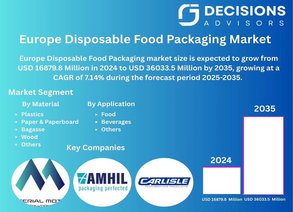 A: Europe disposable food packaging market size is expected to grow from USD 16879.8 Million in 2024 to USD 36033.5 Million by 2035, growing at a CAGR of 7.14% during the forecast period 2025-2035.