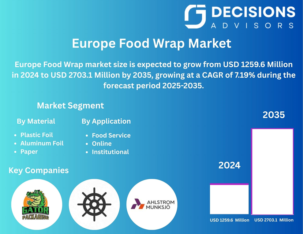 According to a research report published by Decisions Advisors & Consulting, The Europe food wrap Market Size is anticipated to hold USD 2703.1 Million by 2035, Growing at a CAGR of 7.19% from 2025 to 2035. The Europe food wrap market offers strong future opportunities driven by rising demand for hygienic food storage, growth in ready-to-eat products, sustainable wrap innovations, and increasing household and commercial adoption of eco-friendly, biodegradable alternatives.