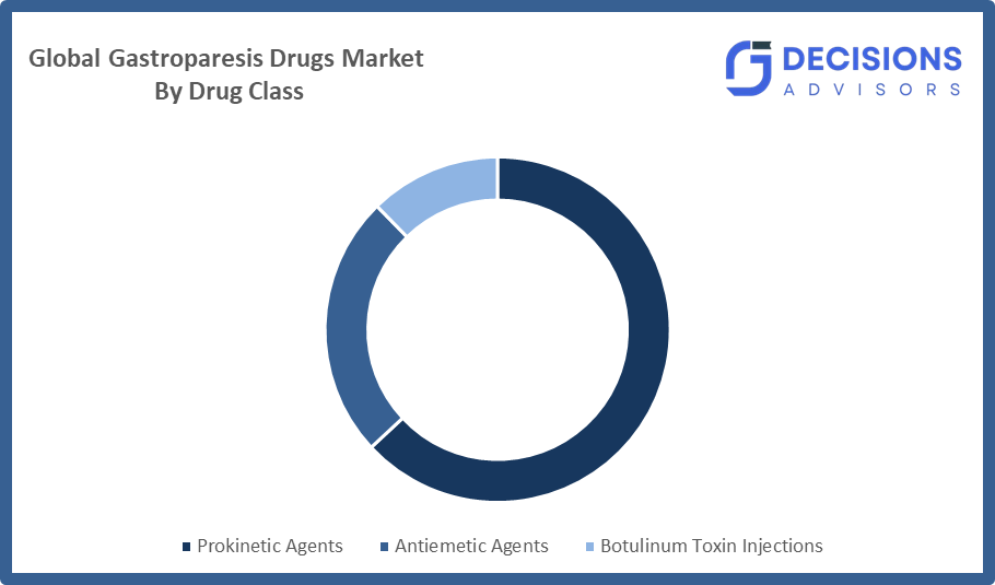 A: Prokinetic agents lead with around 52% share in 2024, as they directly improve gastric motility and treat the root cause of delayed gastric emptying.