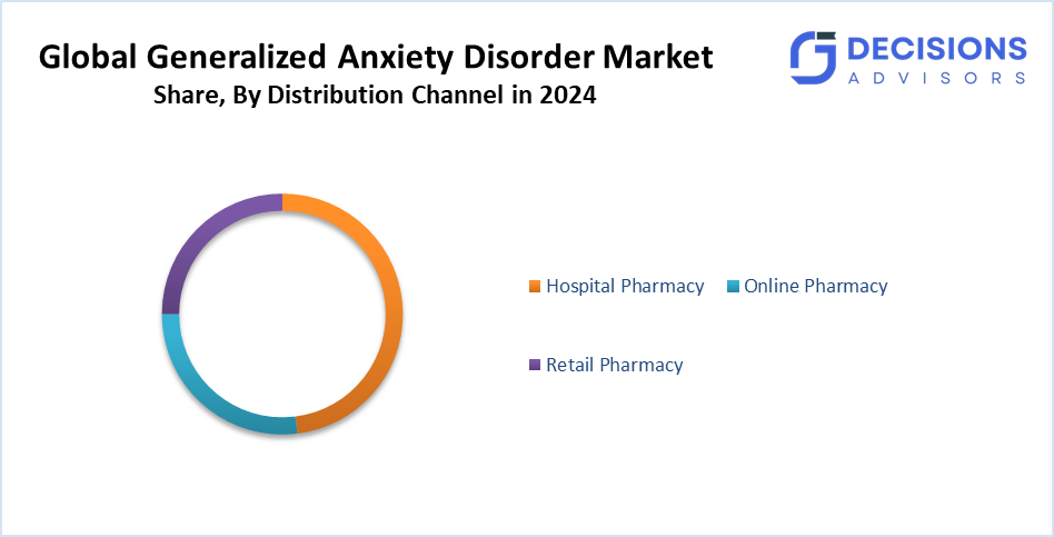 Based on the distribution channel, the generalized anxiety disorder market is divided into hospital pharmacy, online pharmacy, and retail pharmacy. Among these, the hospital pharmacy segment accounted for the largest share in 2024 and is anticipated to grow at a significant CAGR during the forecast period. Hospital pharmacies still contribute significantly and will likely expand as a consequence of structured treatment plans and inpatient mental healthcare.