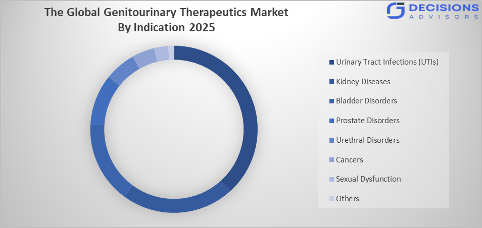 Based on the indication, the genitourinary therapeutics market is divided into urinary tract infections (UTIs), kidney diseases, bladder disorders, prostate disorders, urethral disorders, cancers, sexual dysfunction, and others. Among these, the urinary tract infections (UTIs) segment accounted for the largest share in 2025, contributing approximately 28% during the forecast period. Due to their high global prevalence, recurrent nature, rising antimicrobial resistance, improved diagnostics, and consistent demand for effective therapeutic interventions across diverse patient populations.