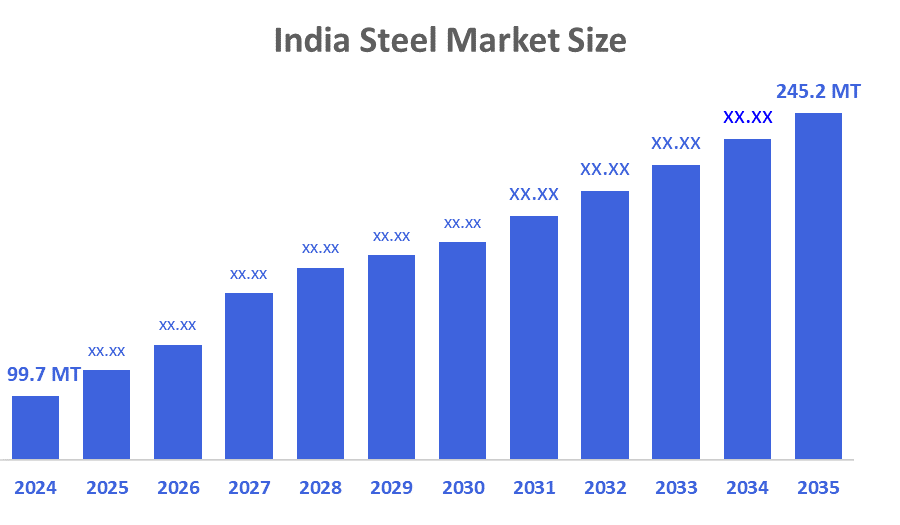 A: India steel market is expected to grow from 99.7 million tons in 2024 to 245.2 million tons by 2035, growing at a CAGR of 8.52% during the forecast period 2025-2035.