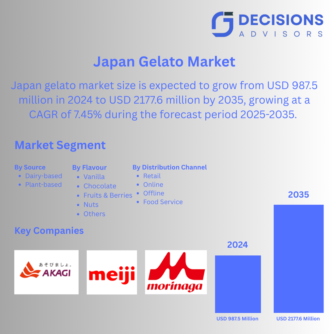 A: Japan gelato market size is expected to grow from USD 987.5 million in 2024 to USD 2177.6 million by 2035, growing at a CAGR of 7.45% during the forecast period 2025-2035.