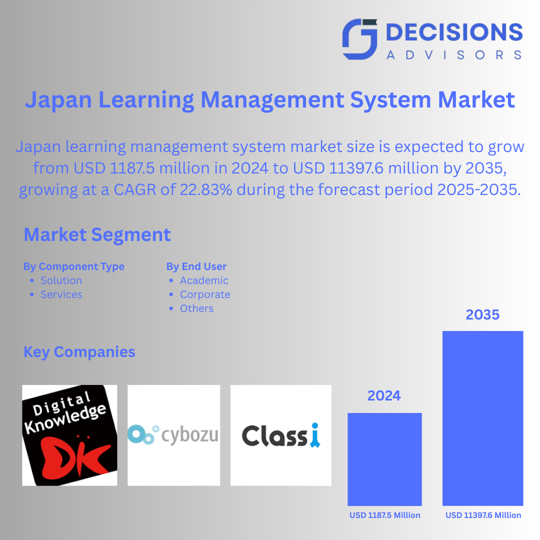 According to a research report published by Decision Advisor & Consulting, Japan Learning Management System Market Size is anticipated to reach USD 11397.6 Million by 2035, Growing at a CAGR of 22.83% from 2025 to 2035. The learning management system market in Japan is driven by government initiatives supporting online education, growing demand for digital training solutions, growing e-learning usage in the business and educational sectors, and technology developments in AI, analytics, and cloud-based LMS platforms.