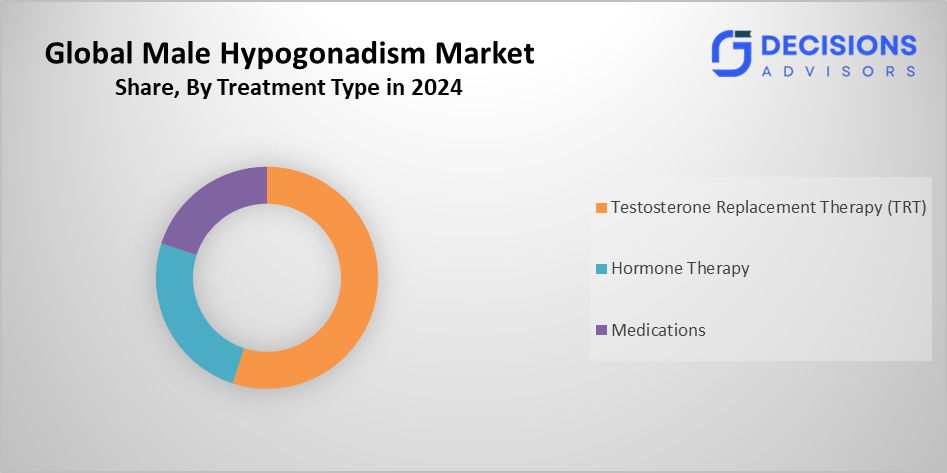 Based on the treatment type, the male hypogonadism market is divided into testosterone replacement therapy, hormone therapy, and medications. Among these, the testosterone replacement therapy segment accounted for the largest share in 2024 and is anticipated to grow at a significant CAGR during the forecast period. It has extensive application and proven efficacy in restoring testosterone levels. It remains the most prescribed treatment due to its direct impact on improving patient quality of life and reversing symptoms associated with low testosterone.