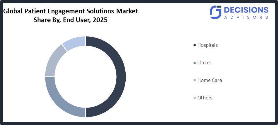 Based on the end-user, the patient engagement solutions market is segmented into hospitals, clinics, home care settings, and others. Among these, the hospitals dominated the market in 2025, accounting for approximately 50% of the total share during the forecast timeframe. The growth of the segment is driven by high adoption of EHRs, patient portals, and telehealth platforms. The clinics segment held around 25% share due to increasing digital adoption among small healthcare providers, while home care settings accounted for nearly 15%, supported by the rising demand for remote patient monitoring and home-based care. The other segment contributed approximately 10% of the market share.