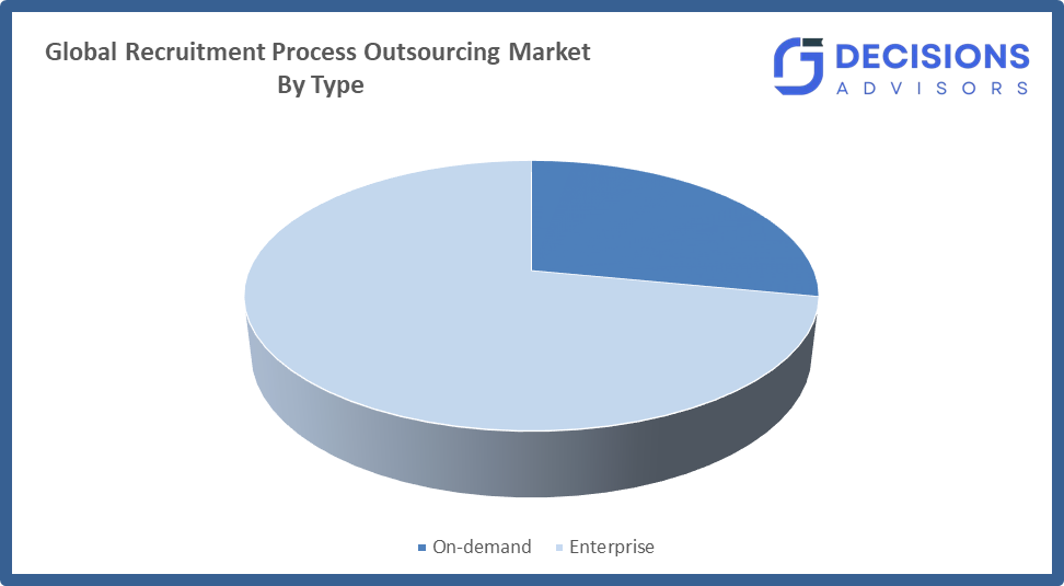 Based on the type, the recruitment process outsourcing market is divided into on-demand and enterprise. among these, the enterprise segment accounted for the largest share in 2024 and is anticipated to grow at a significant CAGR during the forecast period. Enterprise engagement RPO, or full-scale or end-to-end recruitment process outsourcing, delivers organizations an entire recruitment solution through its multi-year contract services. The system provides different services which include candidate sourcing and interview scheduling and onboarding and monitoring and conducting interviews. The system decreases talent pooling requirements which enables organizations to dedicate their resources towards essential business operations. The Fortune 500 companies in both the United States and United Kingdom developed economies require full-scale RPO hiring systems which use specific competency targeting.