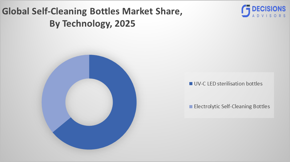 UV-C LED sterilisation bottles dominate the global self-cleaning bottles market, accounting for approximately 64% of the total market share in 2026.