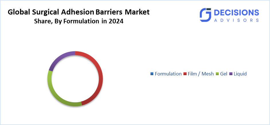 Based on the formulation, the surgical adhesion barriers market is classified into film/mesh, gel, and liquid. Among these, the film/mesh segment accounted for the highest market share in 2024 and is projected to grow at a substantial CAGR over the forecast period. These products have been preferred primarily for the convenience with which they are applied, their flexibility, and their provision of a physical barrier that inhibits tissue adhesion. Film/mesh adhesion barriers have gained a lot of popularity, especially in surgeries of the abdominal and pelvic areas, where the surgeons can quickly place them on the large surfaces.