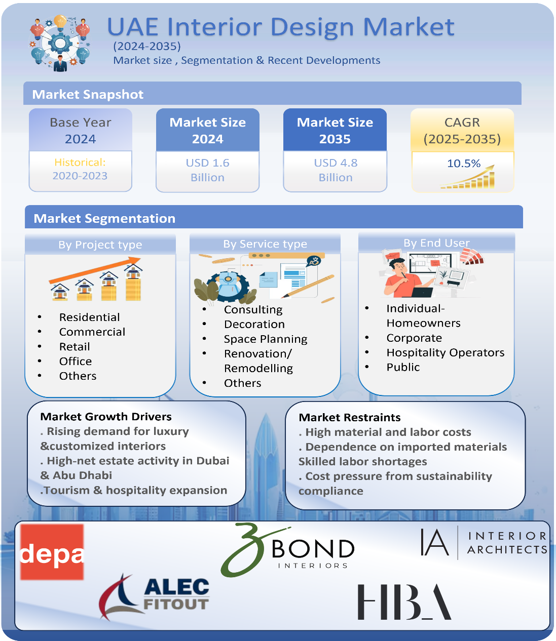 United Arab Emirates Interior Design Market Size, Share, By Project Type (Residential, Commercial, Hospitality, Retail, Office, Others), By Service Type (Consulting, Decoration, Space Planning, Renovation/Remodelling, Others), By End-User (Individual Homeowners, Corporate, Hospitality Operators, And Public), UAE Interior Design Market Insights, Industry Trend, Forecasts to 2035